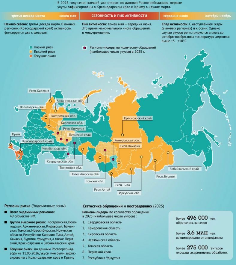 Хотя официальная статистика открыла счет только 23 марта, фактически сезон начался раньше. По словам эксперта, биологические часы паразитов сработали еще в начале месяца, как только сошел первый снег и подсохли лесные прогалины. Клещи просыпаются при температуре +5°C. Теплая весна разбудила их раньше времени.Однако главный фактор риска в этом году — не ранняя весна, а минувшая зима. Она была снежной, что сыграло на руку (точнее, на лапку) кровососущим. Популяция клещей выросла не в геометрической прогрессии, но очень значительно. Паразиты перезимовали с комфортом. Толстый слой снега не дал почве промерзнуть и надежно защитил жилище клещей. Иначе говоря, снег действует как одеяло, защищая лесную подстилку от промерзания.Идеальные условия привели к тому, что уже сейчас, в конце марта, клещи не просто «вяло ползают», а массово выходят на охоту.